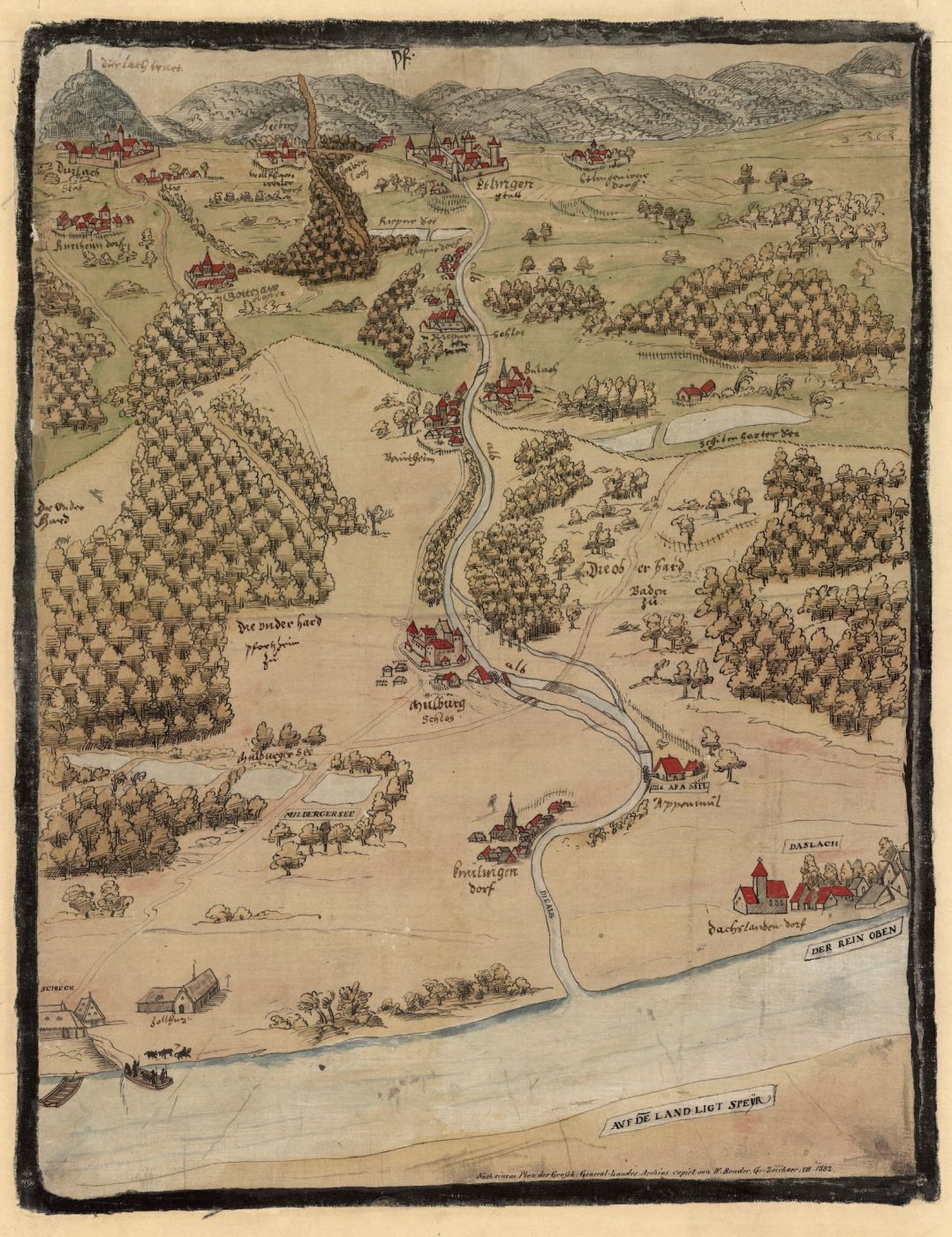 Map of the region around Karlsruhe from the end of the 16th century. Starting from the Rhine river, the map looks east following the river Alb towards the Black Forest. © Stadtarchiv Karlsruhe 8/PBS XVI 1.