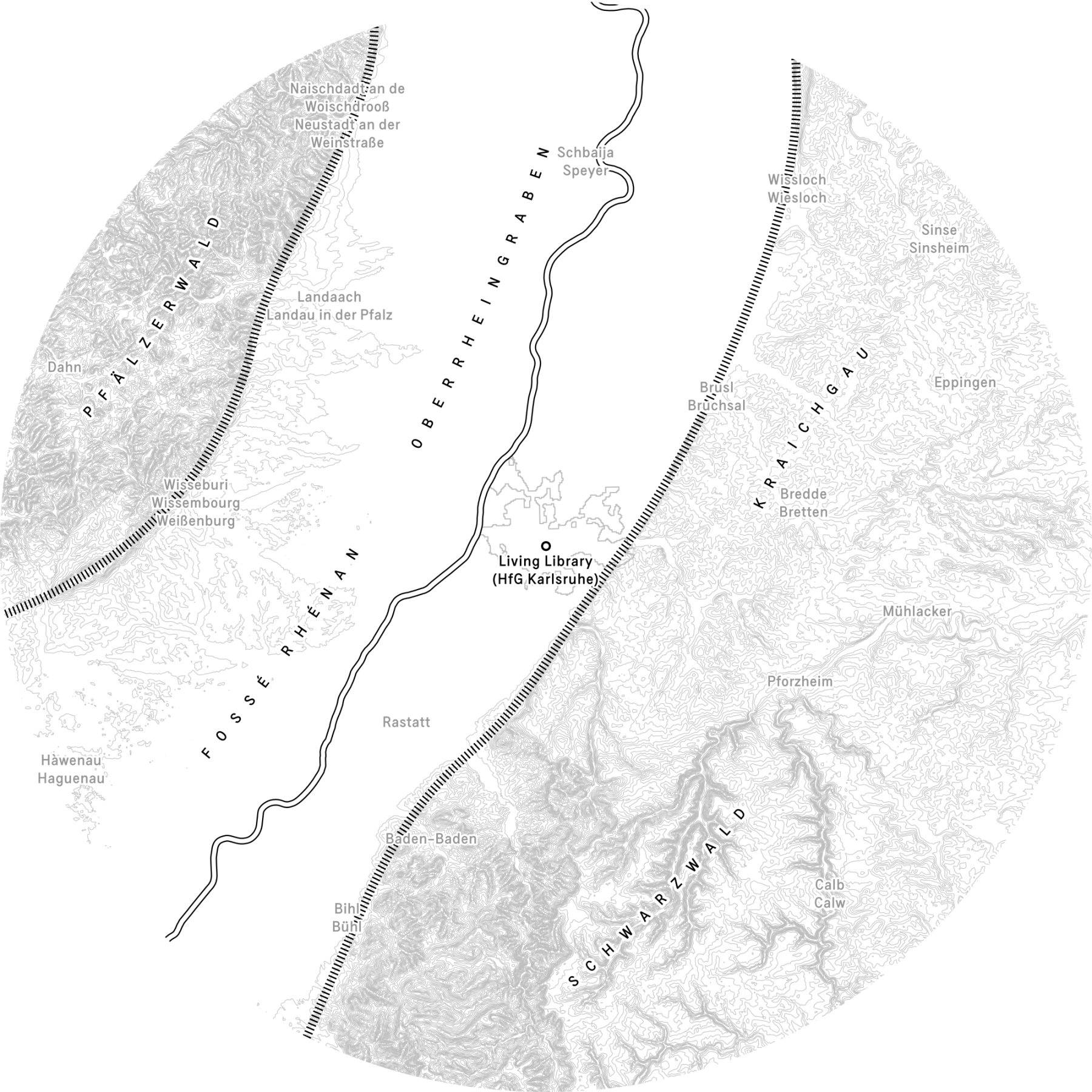 This base map shows the 50-kilometre radius that defines the Karlsruhe bioregion, with the Living Library at its centre. The region can be broadly divided into three areas: the Oberrheingraben/Upper Rhine Graben (framed by two fault lines indicated by dashed lines), a large rift valley formed about 50 million years ago with the river Rhine flowing northwards through its centre (double line); the Pfälzerwald/Palatinate Forest to the west; and the Schwarzwald/Black Forest to the east. The line pattern indicates elevation, revealing an almost flat Graben between two large mountain ranges. To reflect the region’s linguistic diversity, all cities on the map are written in both their local and national names.