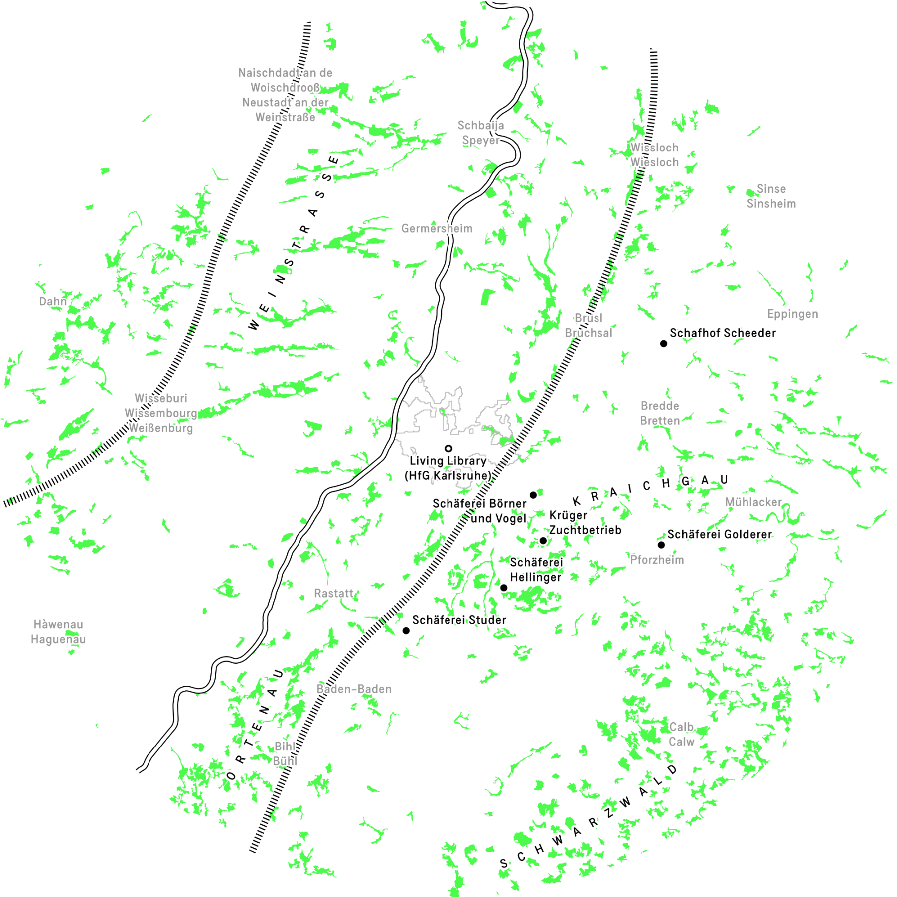 The production of wool in the region around Karlsruhe is closely connected to the South German tradition of nomadic sheep farming. This practice is recognised by UNESCO as part of the nation's Intangible Cultural Heritage. According to statistics from 2019, there were around 215,500 sheep and about 1,300 sheep farmers with 20 or more sheep in Baden-Württemberg (the state in which Karlsruhe is located). Several sheep farms (dots) connected to the workshop ‘On Entanglements and Felting’ are shown here in relation to all areas where livestock is raised (solid dots) within the Karlsruhe bioregion.